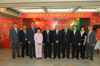 馮志強會長在酒會前致詞時表示:今天我們大家共聚一堂,共同慶祝祖國61週年華誕,大家都感到非常興奮,新中國成立61年來,產生了歷史的巨變,特別在改革開放以來,中華民族邁開了實現偉大復興的雄健步伐,神州大地充滿生機朝氣勃勃,61年來祖國經歷了無數艱辛和洗禮,克服了種種困難當今偉大的中華人民共和國巍峨屹立在地球的東方,中華民族的凝聚力和優良傳統隨之不斷昇華,令全世界為之肅然起敬的偉大民族,作為炎黃子孫,我們為祖國的強大,為民族的偉大,而感到驕傲和自豪。61年來祖國在各個領域都有了長遠的發展,綜合國力和對全球經濟發展的影響力正不斷提升,在國際領域上中國與世界各國的對話與合作穩步推進,在應對國際金融危機氣候變化,糧食安全,公共衛生安全,反恐等全球性挑戰國際多邊舞台上和國際地區事務中發揮獨特的建設作用,國際地位不斷提升,國際上的大事都離不開有中國的參與。